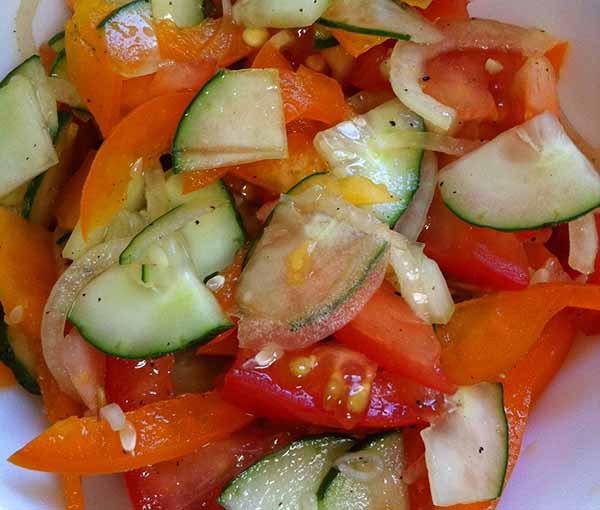 Салат из помидор со свежими огурцами и болгарским перцем.